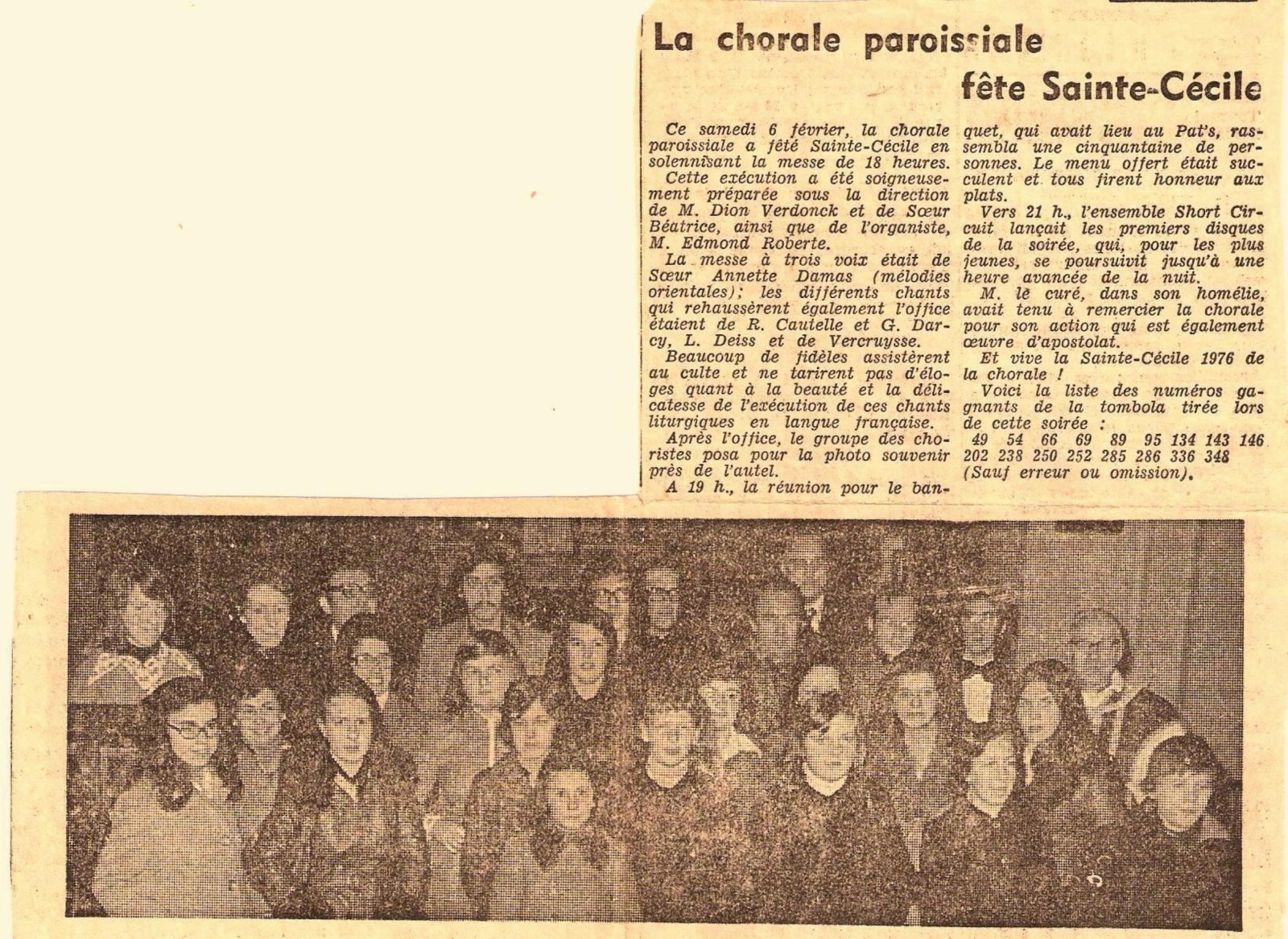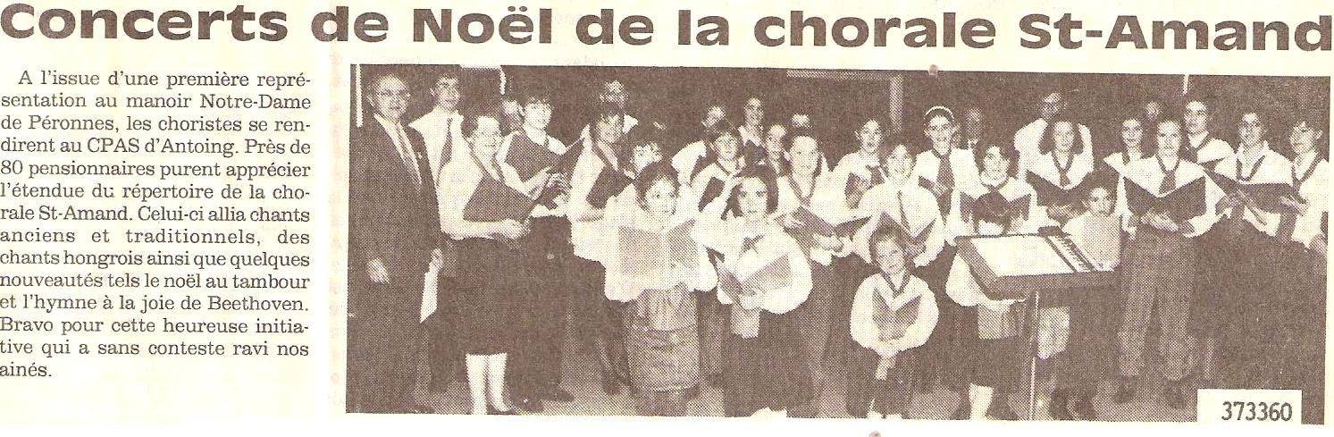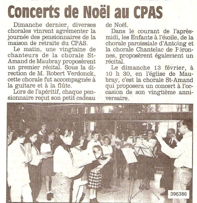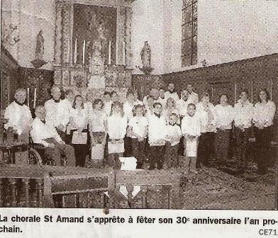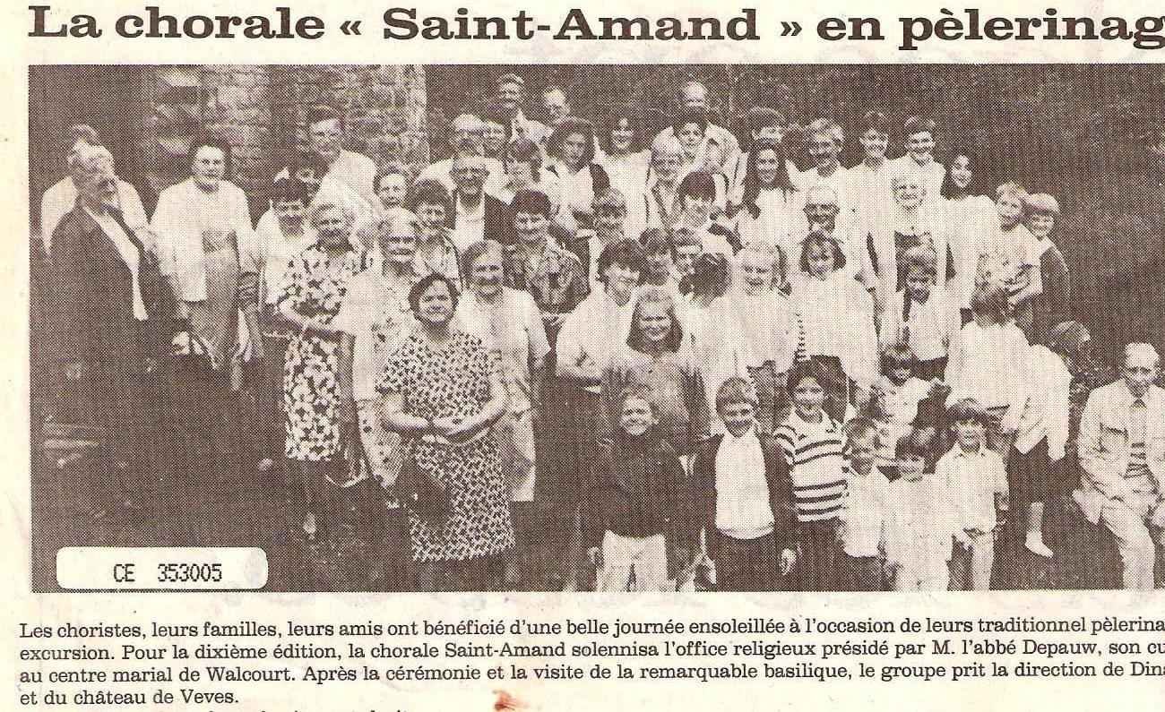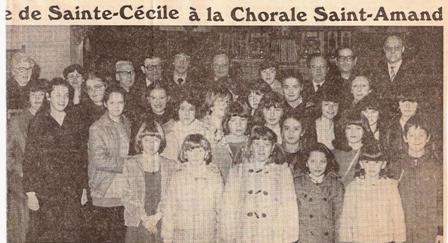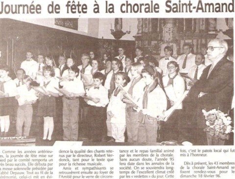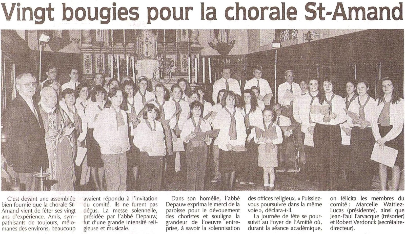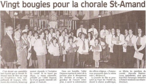 Le 5 février, la chorale Saint-Amand fête ses 15 ans d'existence (faute de documents, la naissance de la chorale ne peut être déterminée avec précision). Sous la direction de Robert Verdonck nous fêtons un double événement : les 15 ans d'existence de la chorale et les 10 ans de direction de Basile. La qualité du programme présenté démontre la vitalité du groupe vocal. Les morceaux interprétés sont à la fois contemporains et plus anciens (Palestrina)