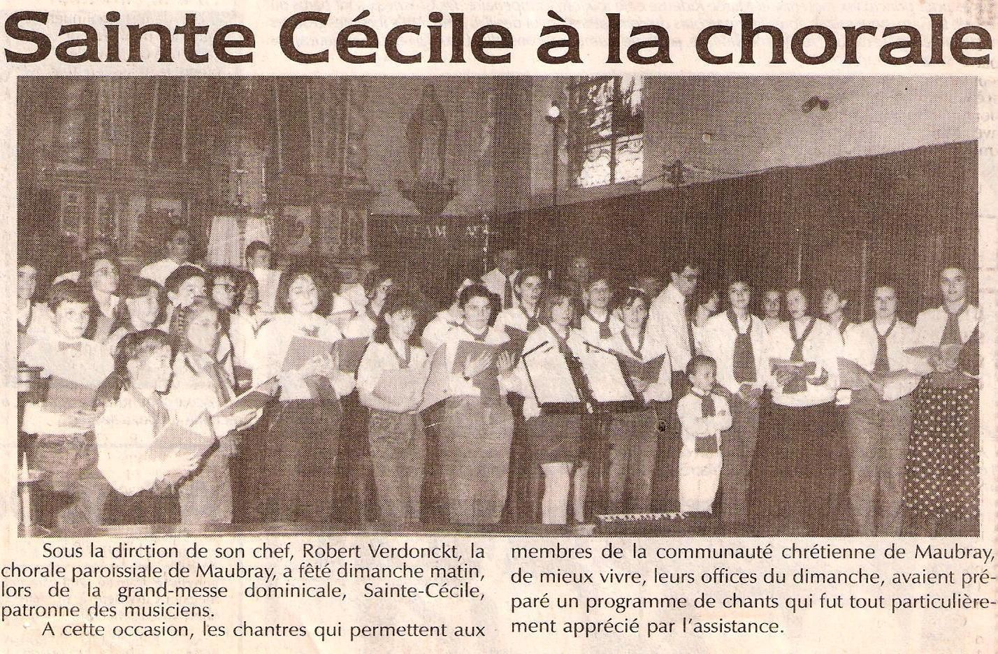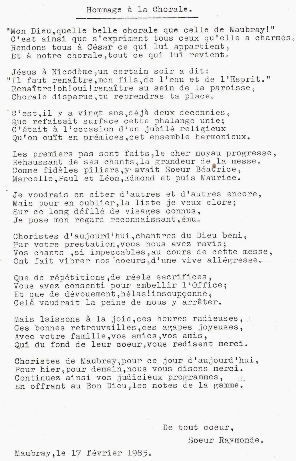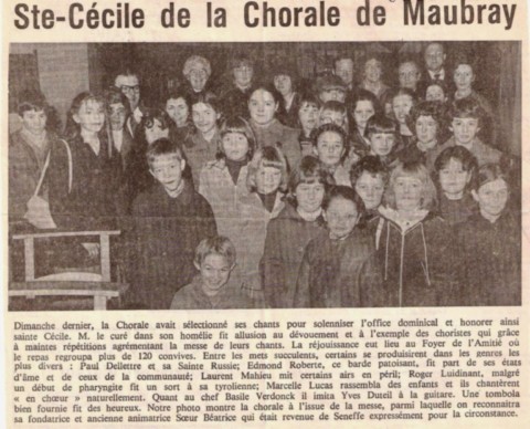 Sœur Béatrice, fondatrice de la chorale, quitte Maubray pour Seneffe. Une messe d'action de grâces, soigneusement préparée par la chorale, fut célébrée en son honneur le 19 septembre.