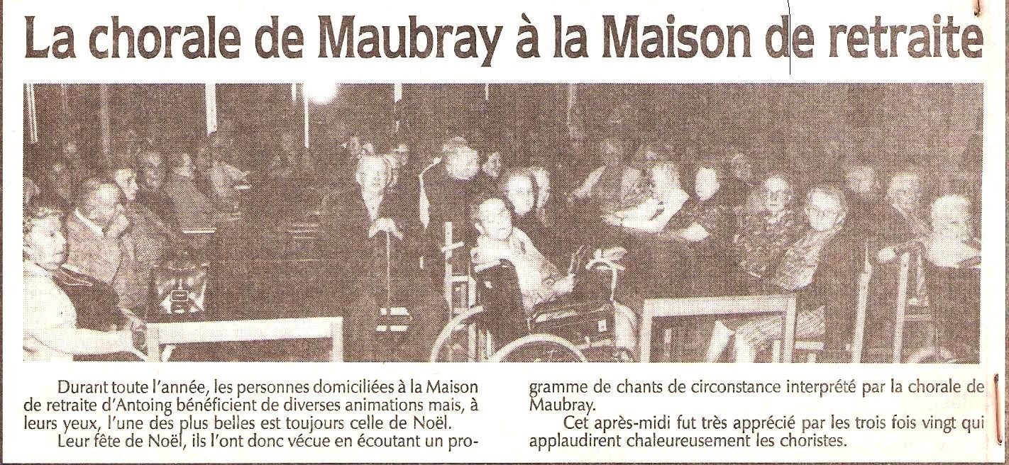 Après avoir chanté la veillée de Noël du 24 décembre à 11 h 30 et la messe de minuit, la chorale offre un concert à la maison de retraite d'Antoing le 26 décembre à 11 h 30. Apéritif et repas avec les personnes âgées.