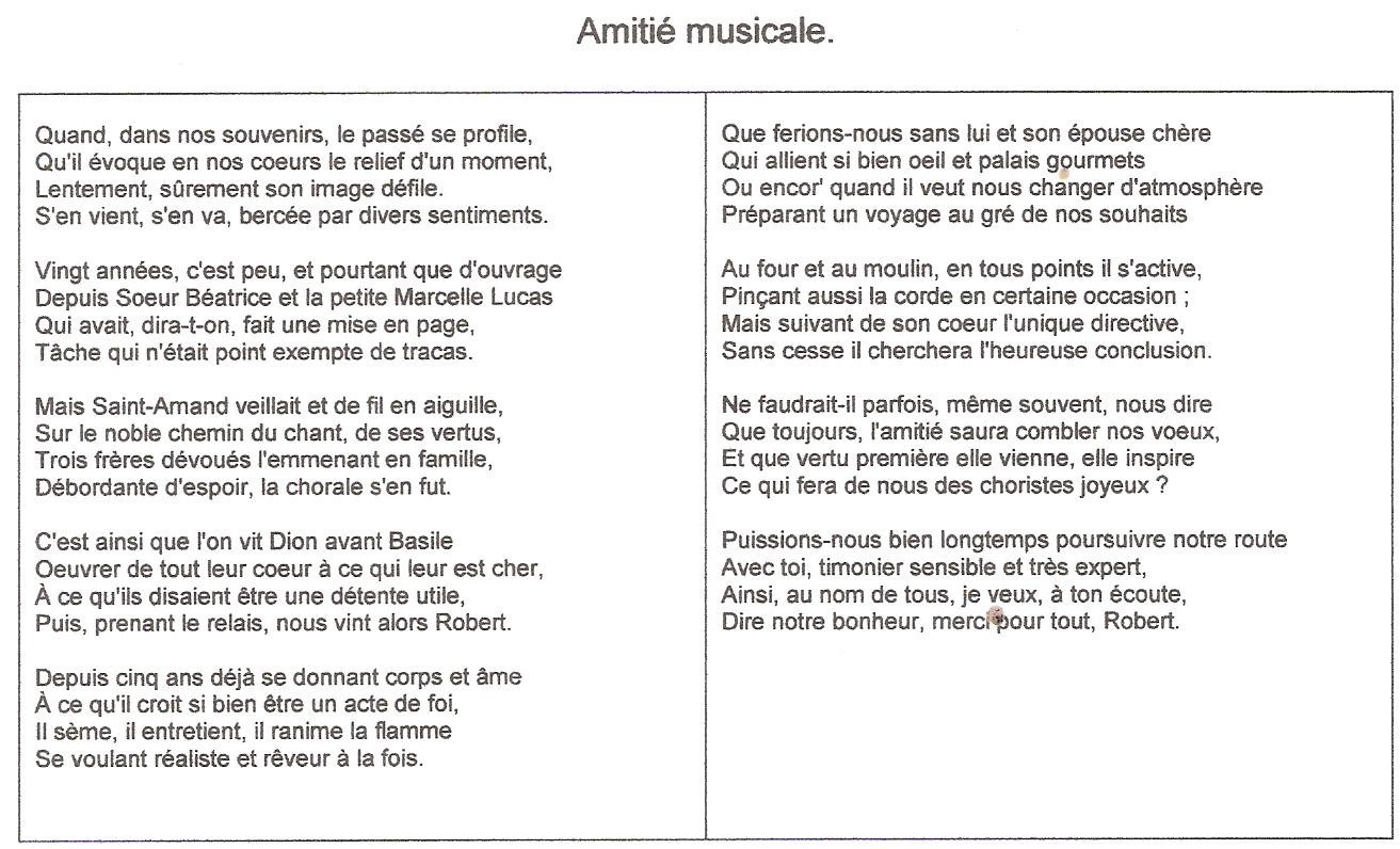 Non sans émotions, Basile a cédé la direction de sa chère chorale à son frère Robert. Sous sa direction la chorale Saint-Amand a fait de gros progrès dans ses interprétations "a cappella" depuis le décès d'Edmond Roberte.