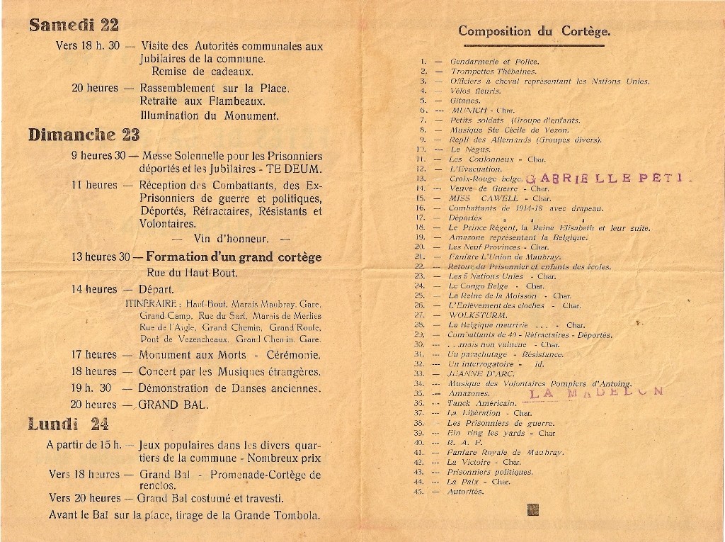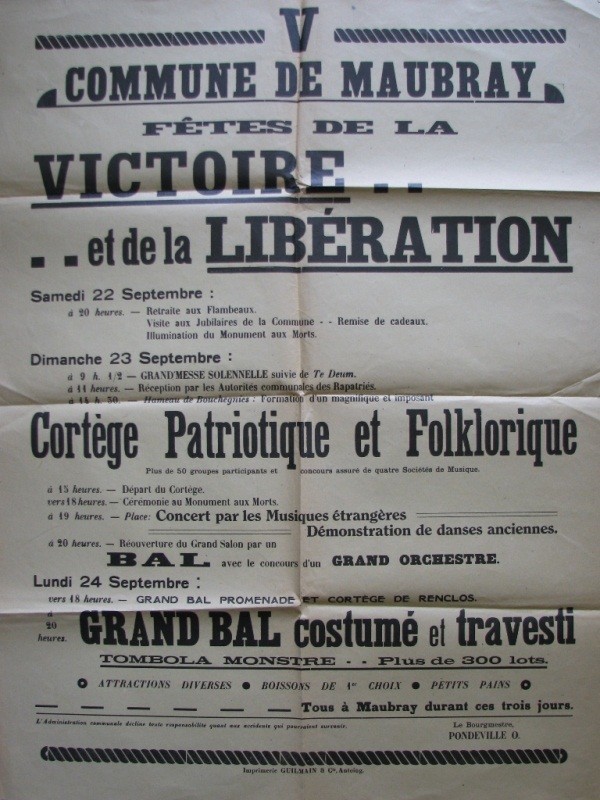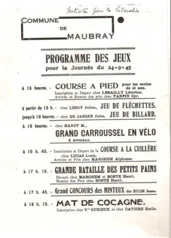 La population maubraisienne a attendu avec impatience le retour de son dernier détenu pour fêter la libération; cette commémoration eut lieu les 22, 23 et 24 septembre 1945, comme l’atteste le programme ci-après :