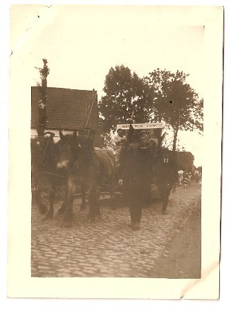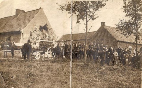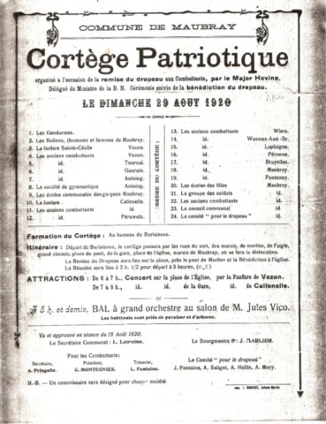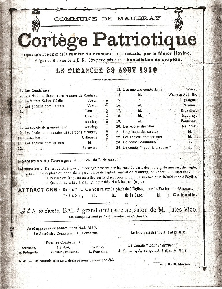 Le dimanche 29 août, conformément au programme reproduit ci-après, un autre cortège patriotique parcourut les rues du village, du Burisieaux jusqu’au Marais de Maubray (derrière l’église); il fut organisé à l’occasion d’une remise de drapeau aux combattants par un représentant du Ministre de la défense nationale. Photo : Cortège 1920