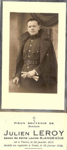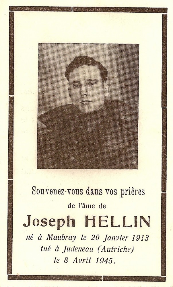 Notre cher prisonnier était âgé de 32 ans. Rappelé à la mobilisation au 6e Chasseurs en septembre 1939 il fut fait prisonnier à Louvain et interné au camp XVII B en mai 1940. A la demande d’un fermier, à Judenau, en Autriche. Pendant cinq ans, il travailla à la ferme et à l’atelier de sondage. Là, par sa simplicité, sa droiture et son attitude digne, il sut s’attirer le respect et l’estime de son employeur, qui le traita avec bienveillance. Il prenait patience et gardait l’espoir au cœur. Dans son long exil, il tâchait dans les lettres qu’il écrivait à sa mère d’encourager celle-ci, une brave veuve qui l’attendait impatiemment. A chaque retour de prisonnier, la pauvre mère s’y rendait espérant avoir des nouvelles de son enfant. Hélas, la libération qui délivrait tous nos prisonniers devait lui être fatale. Réfugié dans un abri avec les fermiers et d’autres prisonniers il fut lâchement fusillé le 7 avril 1945 vers 5.30 H avec deux camarades alors qu’il sortait de l’abri, ses valises en main, prêt à prendre la route qui devait le ramener près des siens.