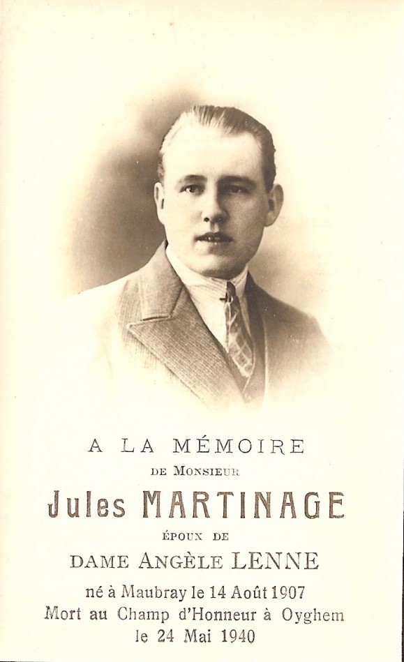 Jules Martinage (le p’tit Jules, comme ses musiciens l’appelaient) était le directeur musical de « L’Union » depuis 1932. Son dévouement inlassable avait intensifié la vie cordiale de la fanfare. Il est tombé, face à l’ennemi, en soldat et à son poste, à 33 ans, en mai 1940, quelques jours après la déclaration de guerre, à Oyghem, en Flandre occidentale.