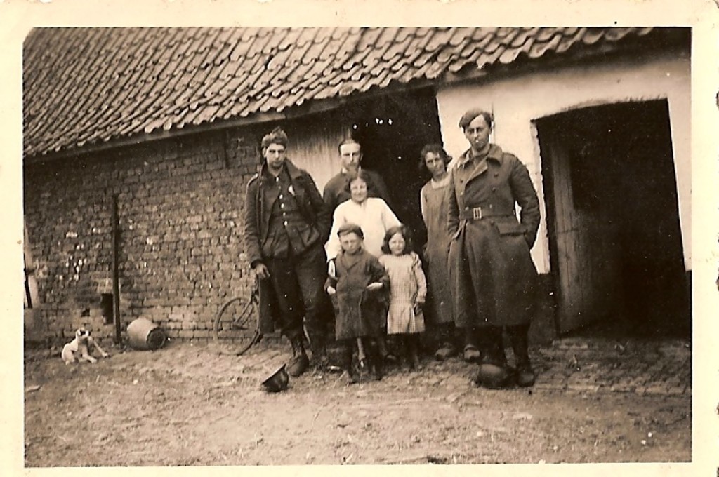 De gauche à droite : Louis LEFEBVRE, Gérard DUMONT, Oscar PONDEVILLE (surnommé « el Paveu » ; bourgmestre), Lucien VERFAILLE (dit « le gros Lucien ; secrétaire communal) et sa fille Claudette, Gérard PLANCHON, Joseph LEVEAUX (père de Elie LEVEAUX), Juliette DELHAYE et sa fille Raymonde PATERNOTTE