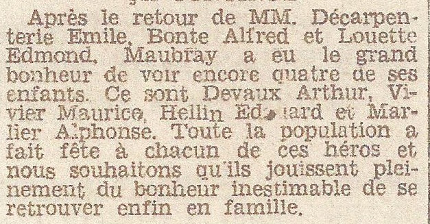 Prisonniers rapatriés : Henri BAUFFE, Léon BRABANT (stalag IV A; retour en oct. 40), Armand DUFOUR, Albert DONNEZ, Lucien DEREPPE (rapatrié en septembre 1942), Albert HELLIN, Floride HELLIN, Léonce HELLIN, Georges HUBIN, Georges LECLERCQ, Gaston LELEU, André DEMAIRE, Victor MONTIGNIES, Octave VARLET, Amé WATTIEZ.