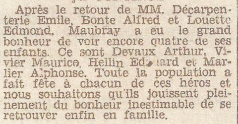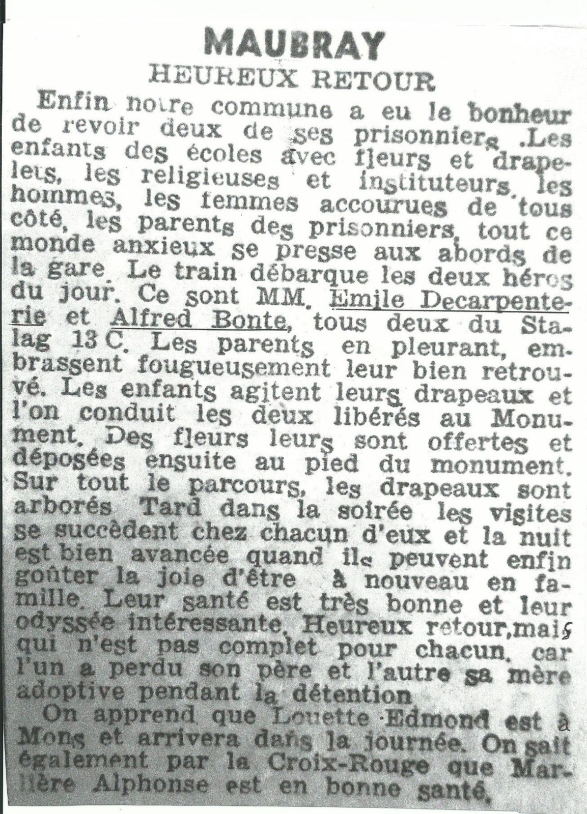 a) Retour d’ALFRED BONTE et EMILE DECARPENTERIE le 20 mai 1945.