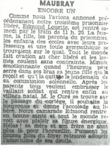 Toute la population, tristement émue, présente à la mère éplorée et à la famille du pauvre soldat ses sincères condoléances. Puissent les nombreuses marques de sympathie qui leur sont adressées adoucir le chagrin qui les accable dans cette pénible épreuve.