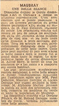 Les prisonniers ont commencé à rentrer au village au cours du mois d’avril 1945, au fur et à mesure de la libération des camps. L’extrait ci-après du « Courrier de l’Escaut » du 4 mai 1945 fait état du retour à cette date des sept premiers d’entre eux. Ils assistèrent, au patronage, à la représentation théâtrale donnée par le cercle dramatique ARS et CARITAS du 29-04-1945 (voir à ce sujet le reportage sur les Cercles Dramatiques; B-II-2 sur le présent site) :