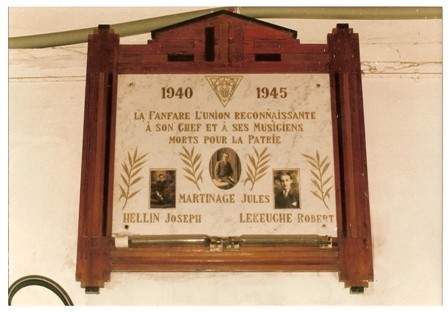 II.- Une société locale – la Fanfare L’Union – paya un lourd tribut au deuxième conflit mondial : elle perdit non seulement son chef (Jules Martinage) mais aussi deux de ses musiciens (Joseph Hellin et Robert Lekeuche). Un mémorial, qui leur a été dédié, trône toujours aux cimaises du Salon Jurion. Photo : Mémorial