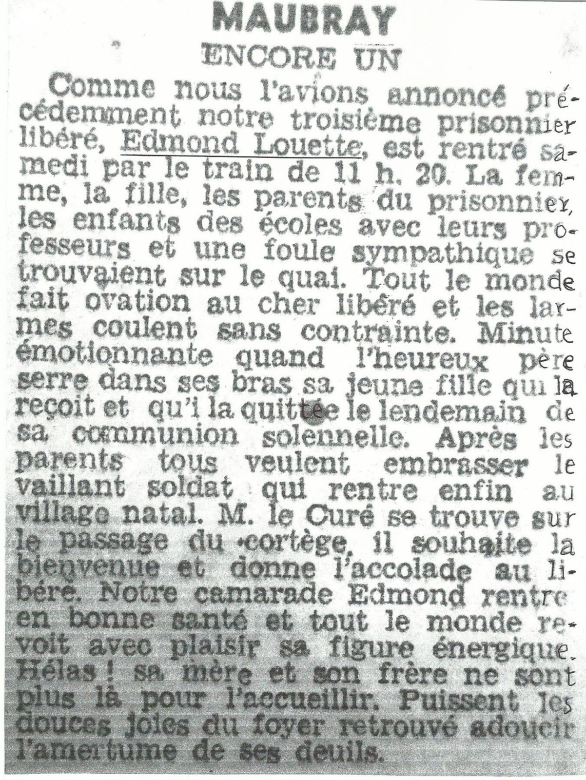 Les détenus revinrent un à un (parfois en duo) et firent toujours l’objet d’un accueil des plus chaleureux de la part de la population. Chaque fois qu’un retour était annoncé – il se faisait le plus souvent en train – la foule s’agglutinait près de la gare afin de conduire ces « héros » pour un hommage devant le monument aux morts (lequel fut érigé en 1924, dans la rue de la gare).